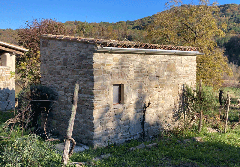 Auf den Fundamenten einer nicht mehr benötigten Versitzgrube wird in Eigenbau ein kleines Garten- und Atelierhaus errichtet. Fast alle Materialien bestehen aus gebrauchtem Material und wiederverwendeten Bauteilen. Die Wände werden mit Natursteinen gemauert, die von Durchbrüchen im Haupthaus angefallen sind, ergänzt durch Steine aus dem nahen Bachbett. Das Pultdach besteht aus alten und neuen Balken und wird mit gebrauchten Mönch und Nonne Ziegeln eingedeckt. Zwei Fenstertüren aus Lärchenholz stammen von einem abgebrochenen Wintergarten.