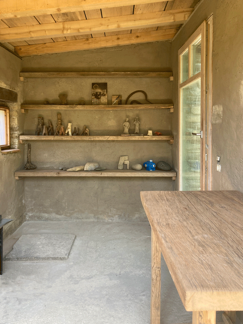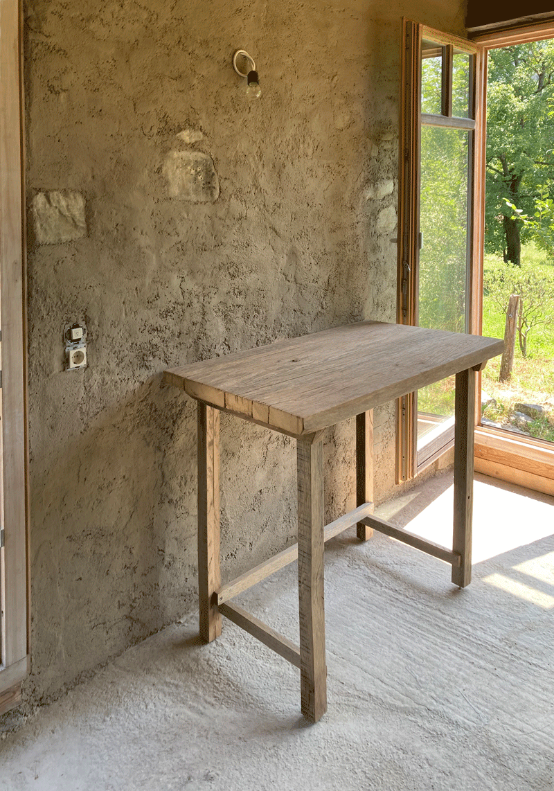 Die Innenwände erhalten einen Putz mit Lehm vom eigenen Grundstück. Als Inneneinrichtung wird noch ein Regal und ein kleiner Werktisch aus altem Eichenholz gebaut.
